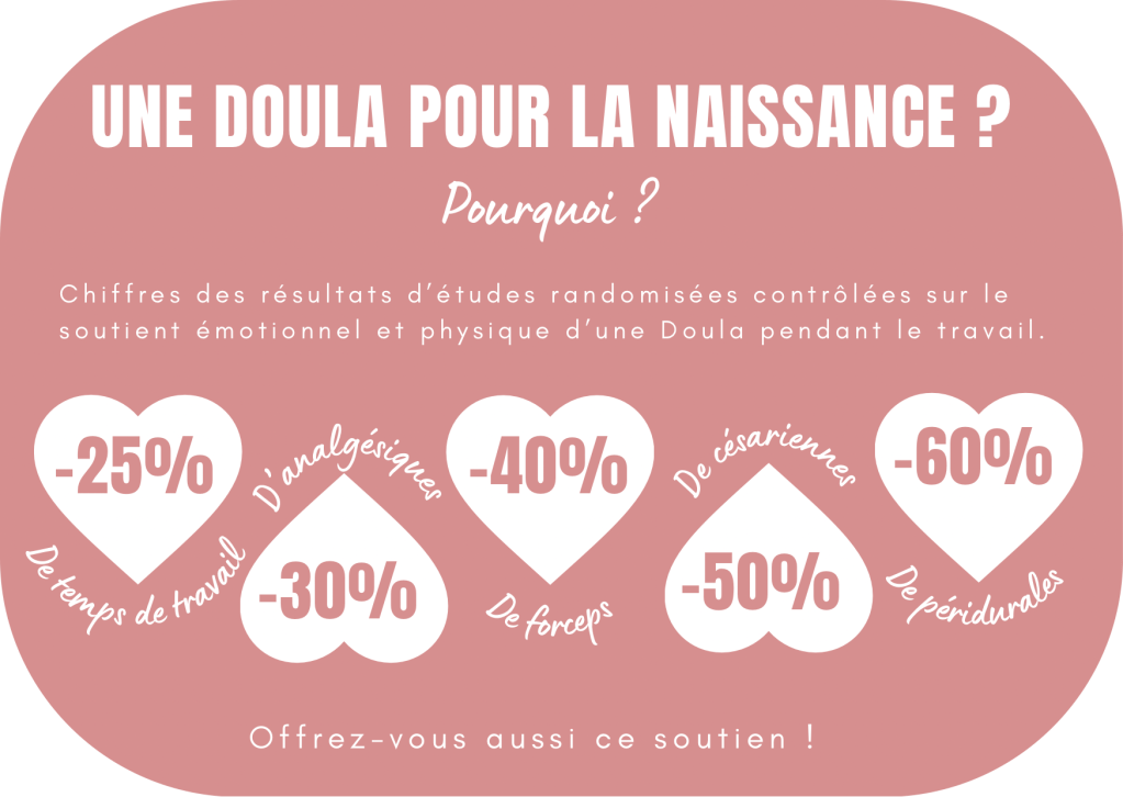 Sources : “The Doula Book How a Trainer Labor Companion Can Help You Have a Shorter, Easier and Healthier Birth” (Second edition) – Marshall, Phyllis Klaus and John Kennell (Perseus Press, 2002) / “Support in labor” (soutien pendant l’accouchement) publié par MIDIRS (the Midwives Information and Resource Service, Grande Bretagne) qui présente les statistiques de 10 études randomisées contrôlées portant sur plus de 3000 femmes.