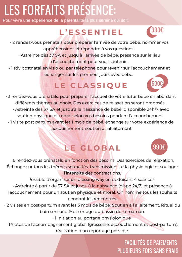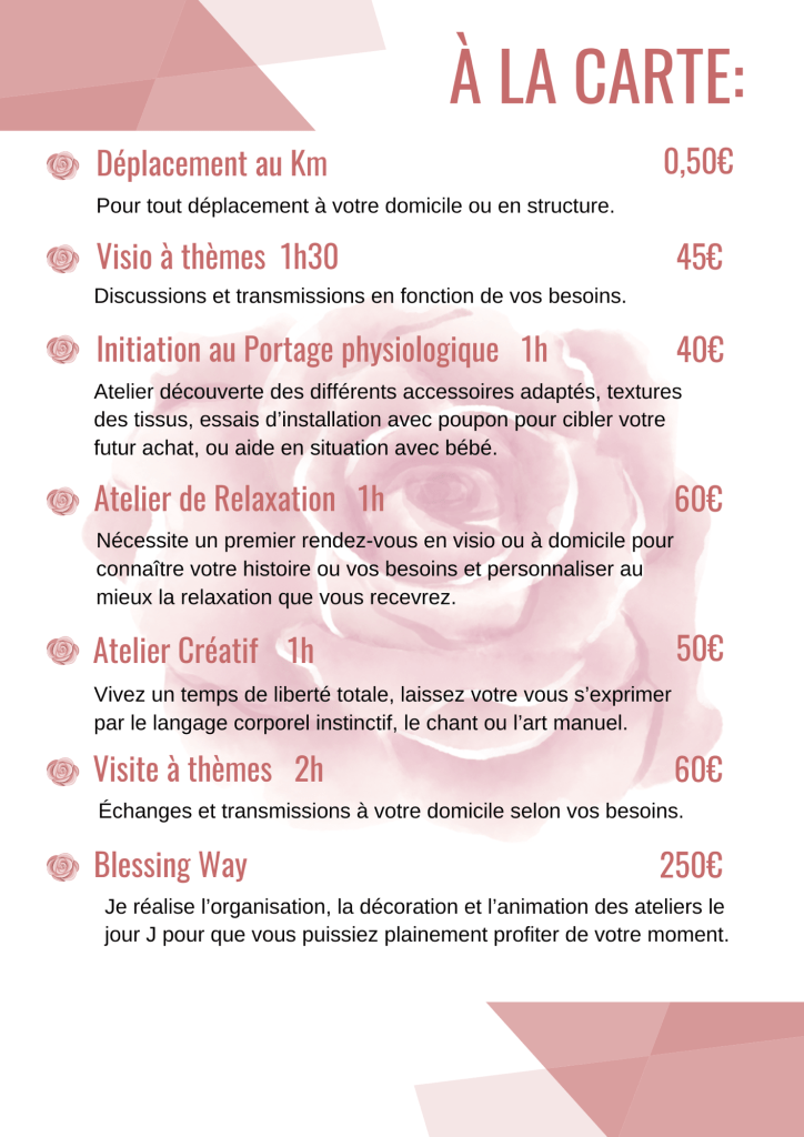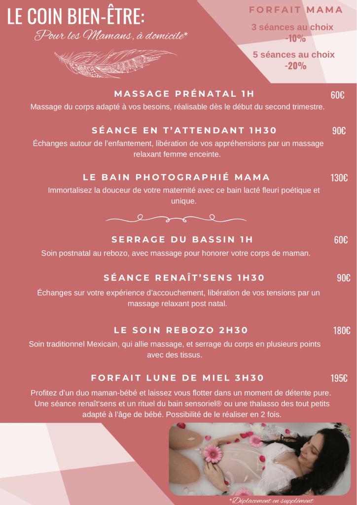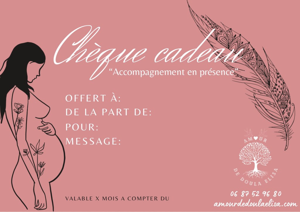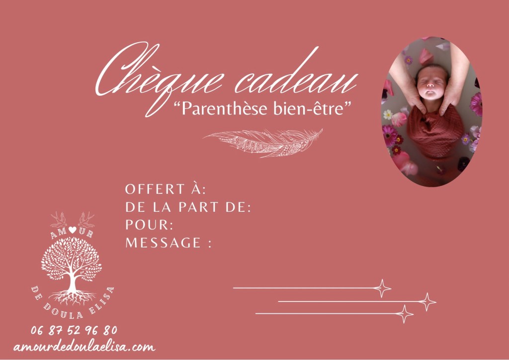 Je propose aussi des chèques cadeau, qui vous permet d’offrir mes services autour de vous ou d’ajouter à votre liste de naissance les prestations de votre choix afin de recevoir un présent unique, agréable et précieux… Contactez-moi pour l’obtenir dès à présent !